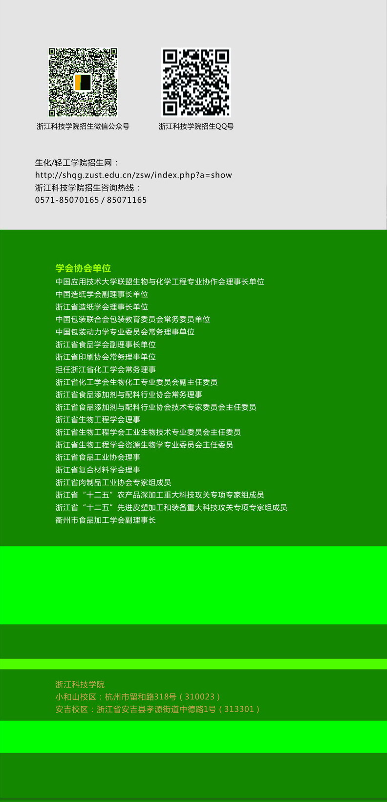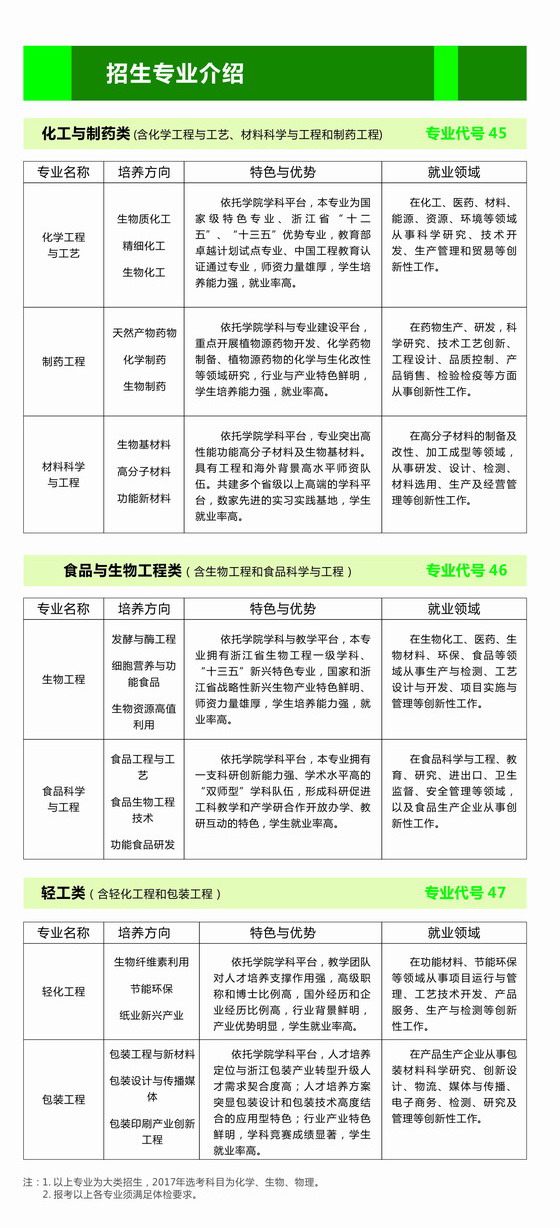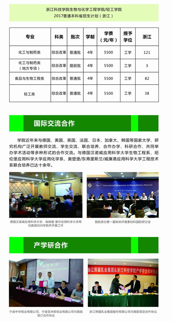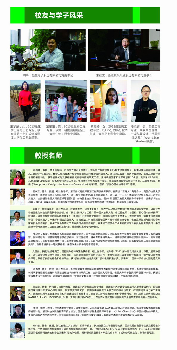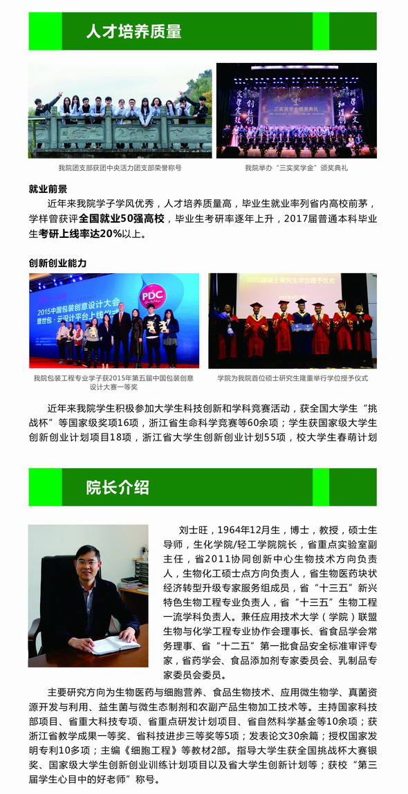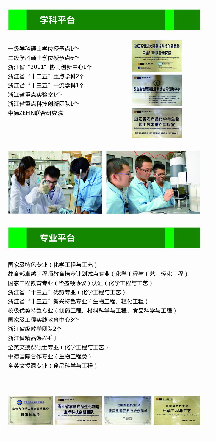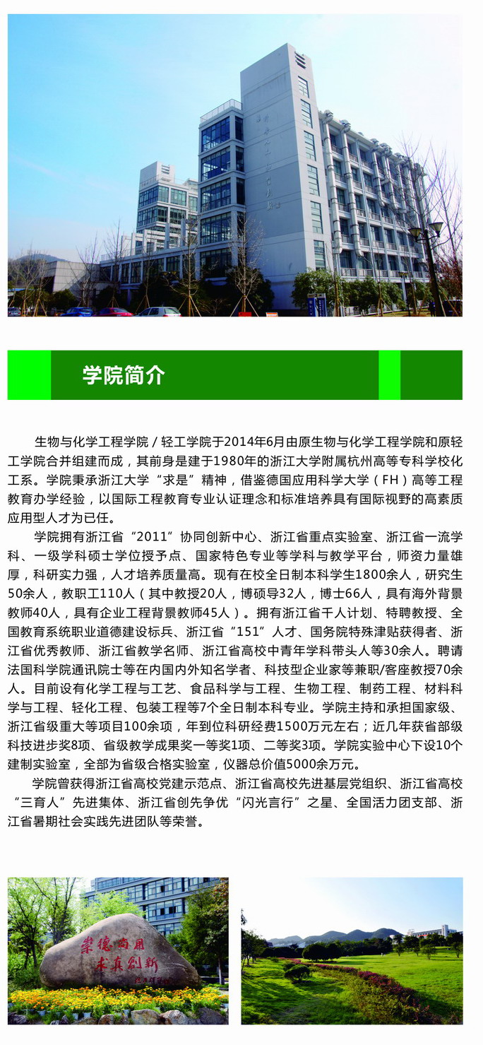 生化轻工学院是学校唯一具有省级最高学科平台省2011协同创新中心的学院,是学校唯一同时拥有国家级特色专业、浙江省优势特色专业、浙江省一流学科、浙江省重点实验室的学院,学院教学、科研、学科建设、社会服务一直走在学校前列,拥有一支关爱学生成长成才的国家师德标兵、浙江省劳动模范、浙江省优秀教师、国务院特殊津贴获得者、省中青年学科带头人等省部级人才30余位教师、近70位博士教授的老师队伍,就业率、考研、出国深造的学生连年位学校前列,欢迎广大青年学生来学习深造。
