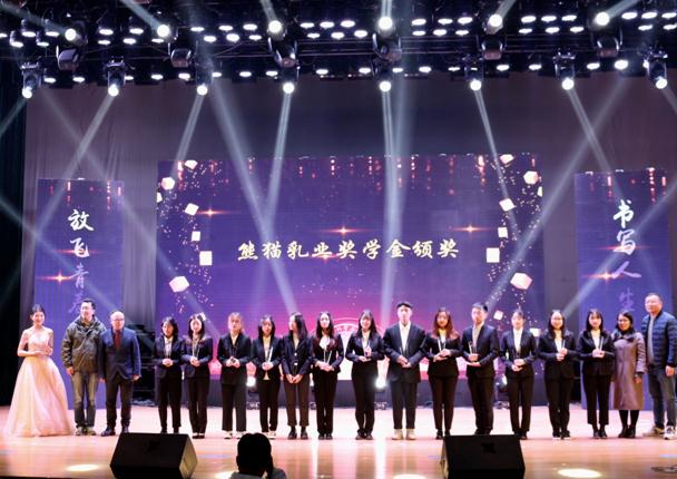 (颁奖嘉宾为熊猫乳业奖学金获奖同学颁奖)