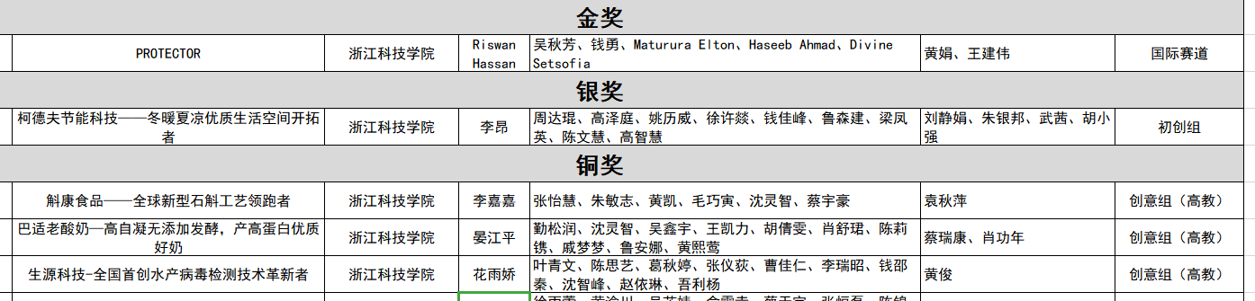 在刚刚结束的“建行杯”第六届浙江省国际“互联网+”大学生创新创业大赛中,我院获奖数量、获奖等级都创历史新高,获金奖1项、银奖1项和铜奖3项的好成绩:黄娟老师指导项目《PROTECTOR》获国际赛道金奖;朱银邦老师指导项目获初创组银奖;黄俊、袁秋萍、蔡瑞康、肖功年老师指导的项目获创意组铜奖。具体名单如下(学工办 蔡瑞康)