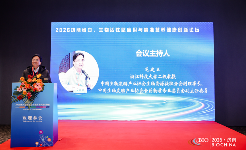 2026年3月9日,由浙江科技大学生物与化学工程学院、浙江省农业资源生化制造协同创新中心与中国生物发酵产业协会生物资源提取分会、中国生物发酵产业协会食药物质专业委员会联合主办的“2026功能蛋白、生物活性肽应用与精准营养健康创新论坛”在济南黄河国际会展中心成功举行,来自浙江科技大学、浙江大学、齐鲁工业大学、未名太研生命科学大健康研究院、安琪酵母股份有限公司、浙江艾格生物科技股份有限公司、山西吕梁野山坡食品有限责任公司、鑫锐生物科技有限公司、重庆万元佳药业有限公司、湖州安托迪亚生物科技有限公司、舒果生物科技有限公司、毛氏守正药业、宁波三生中国健康产业有限公司等国内高校与企业的专家学者、企业家、技术骨干等百余人参加了本次会议,中国生物发酵产业协会副理事长王洁参加了会议,我院二级教授、中国生物发酵产业协会生物资源提取分会副理事长、食药物质专业委员会副主任委员毛建卫主持论坛。